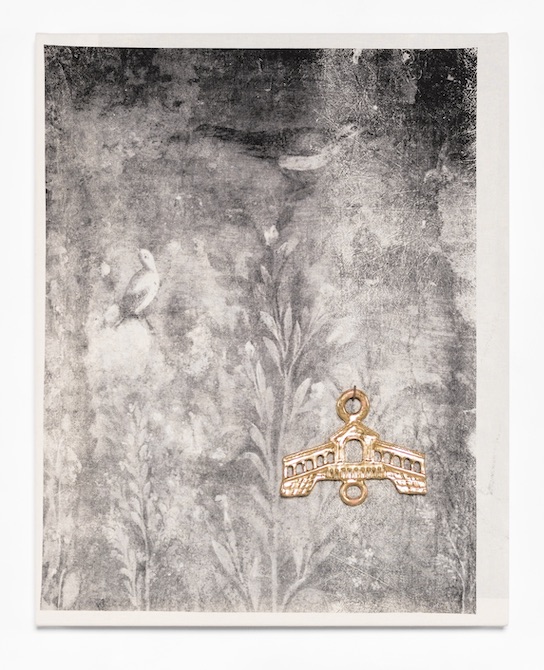 EGO IN ARCADIA 2025, silk screen on canvas, glazed ceramic, 24 carat gold leaf, steel, 100 x 80 x 10 cm
